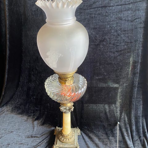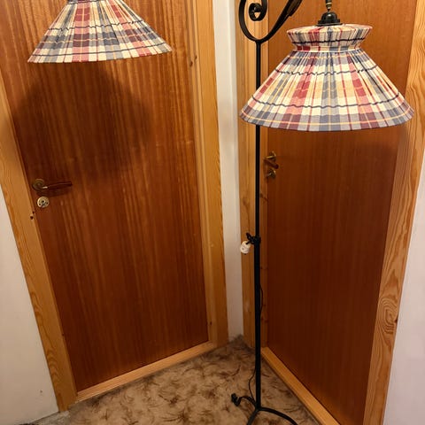 Lampen har dekorative detaljer i smijern og står støtt på fire bein!