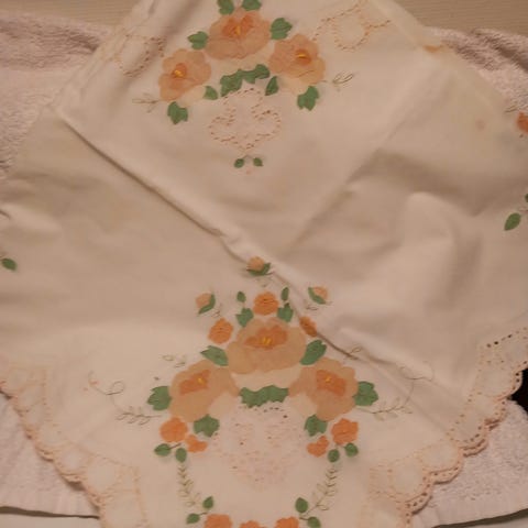 Vintage Kjøkkenhåndkle i lin med rutemønster i blå, rosa og grønn farge. Håndkleet har brodert logo i i en dus lakserosa farge. Logoen er litt lysere enn det som viser seg på bildet, kjøkkenhåndkleet er i fin stand.