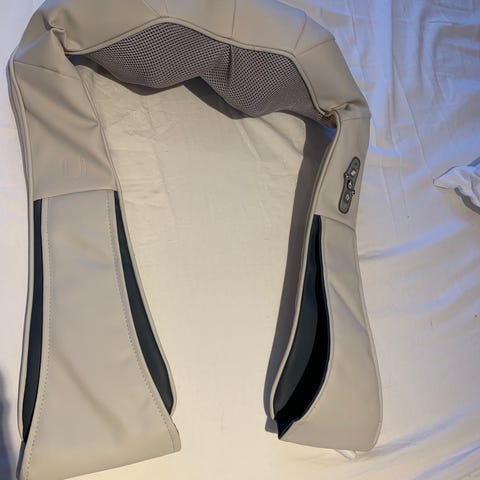 Elektrisk massasjeskjerf i kremfarge med kontroller for justering av massasjeinnstillinger. Designet for bruk rundt nakke og skuldre for lindring av muskelspenninger.