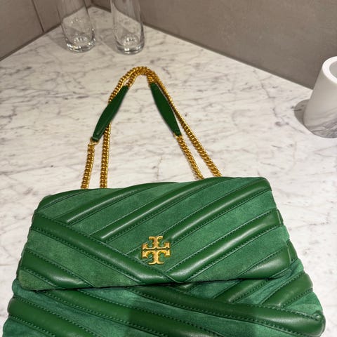 Michael Kors skulderveske laget i lær, designet for dame. Vesken har en rektangulær form med metallnitter på klaffen og en metallås foran. Den har en lang kjedestropp med lærdetalj for bæring over skulderen. Innvendig er vesken utstyrt med flere lommer, inkludert en glidelåslomme, for organisering av småting.