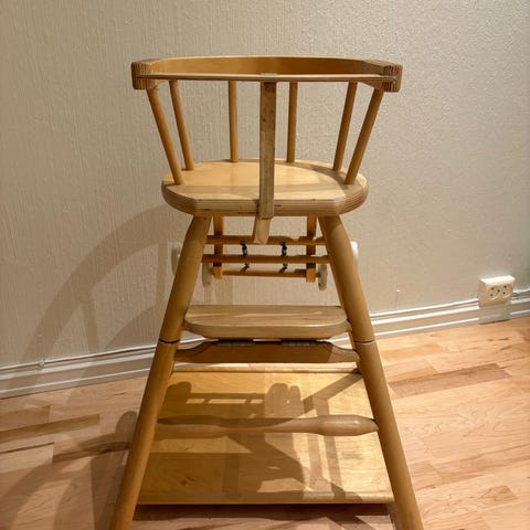 Barnestol i tre med justerbar sitte- og fotplate. Stolen har en ryggstøtte med hull for ventilasjon og et stabilt understell