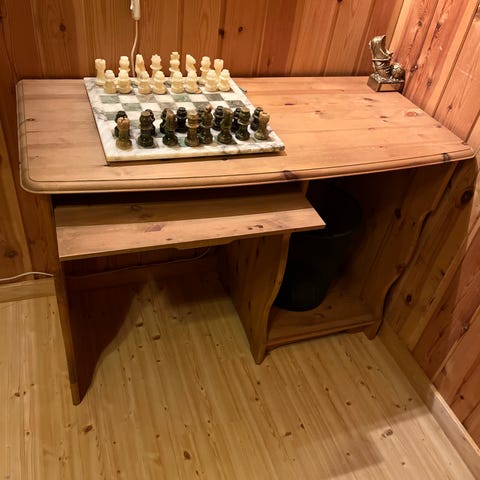Godt brukt skolepult, har en knagg og noen markeringer. Brukt som pc og tv bord.