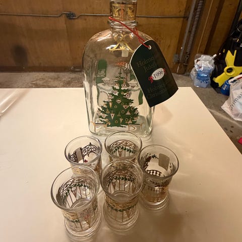 Flasken er fra 1986. Glassene fra ulike årstall. Åtte av glassene er parvis like, mens de fire siste er ulike. Se bilder. Settet selges samlet.