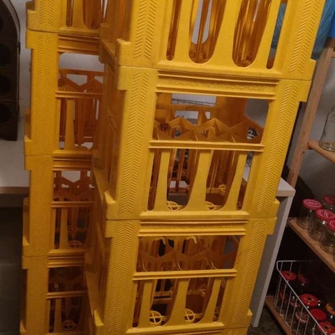 Kassen er i gul plast og egner seg godt til oppbevaring av 1/1 flasker vin elle saft.