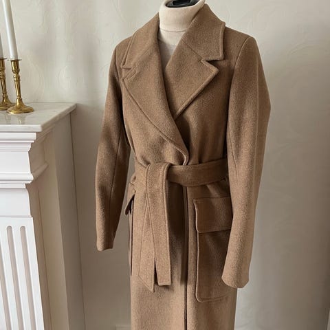 Burgunder Ullkåpe fra MbyM i str XS selges. Den er brukt en gang, ingen bruksmerker. Den har lommer i sidene, en split nederst bak og belte i samme stoff.