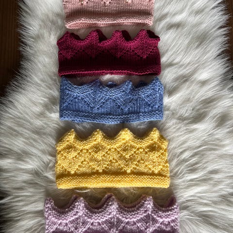 Søkeord: pannebånd, krone, prinsesse, prins, barnehagestrikk, hjemmestrikk, ull, garn, småstrikk, utkledning, skolestrikk, varmt på ørene, julegave, kalendergave, smågave, hodeplagg, varmt på ørene, hårband, ørevarmere, tilbehør, hodeplagg