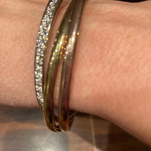 Ukjent merke armbånd for dame i gullfarget metall med tett besetning av små strass-steiner. Armbåndet har en stiv, bangle-lignende utforming og bæres rundt håndleddet. Passer som tilbehør til antrekk der man ønsker et smykkesmykke med tydelig glans.