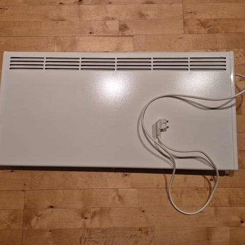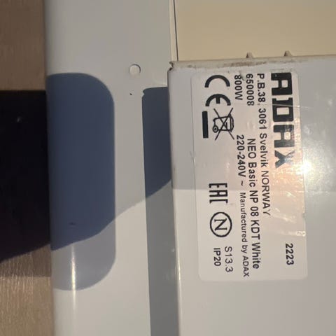 ADAX Elektrisk varmeovn med modellnummer 1743, effekt på 800 watt, i hvit farge. Produktet er beregnet for elektrisk oppvarming.