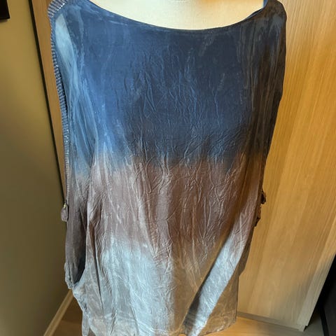 Nydelig topp i figurnær modell. Knytting som gir et fint snitt. Blå og hvit med stjerner. 100% viskose.