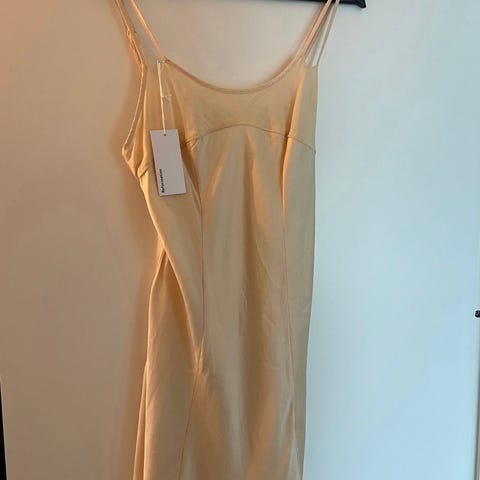 Zara festkjole i størrelse S, laget av beige silkemateriale. Kjolen har spaghettistropper og en kroppsnær passform, egnet for kvinner.