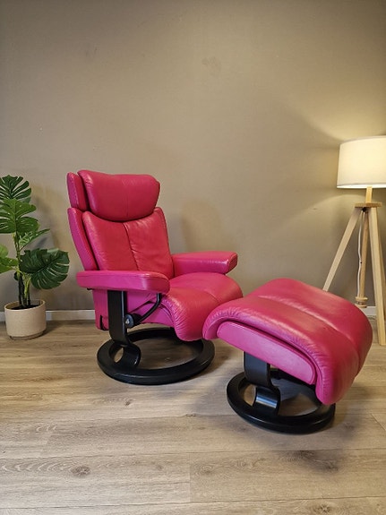 Stressless® Magic er den mest komfortable lenestolen Stressless noensinne har laget. Den er designet for å gi dyp og ergonomisk støtte til korsrygg, nakke og skuldre, og gir en sitteopplevelse der kroppen får hvile naturlig fra første stund. Det myke skinnet, den dype komforten og de rause putene gjør at kroppen slapper av av seg selv, og gir roligere kvelder og mer behagelig hverdag.