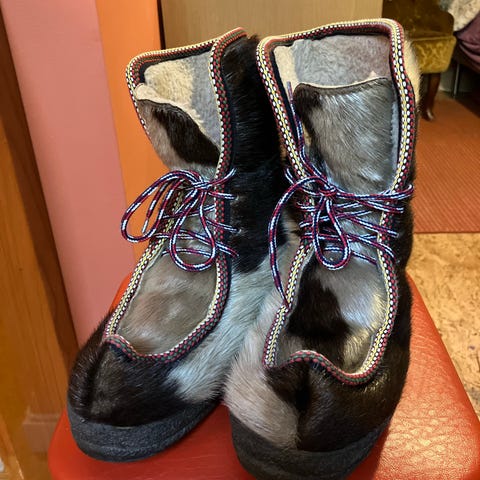 Støvlene er i uvanlig god stand til alderen – pelsen er tett og fin, ingen flekker, sålen er hel, og innsiden er ren, hel og varm.