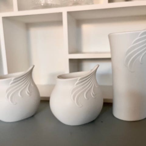 Vase og to lysestaker i Kaiser Bisque porselen fra Tyskland.
