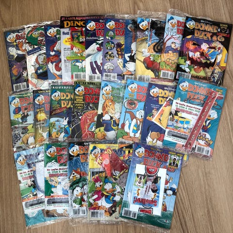 Samling av Donald Duck tegneserier og bøker i forskjellige utgaver og formater. Inneholder både løse blader og innbundne tegneserier.
