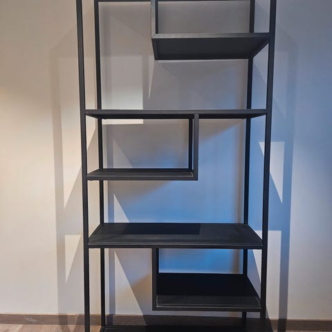 Høy, smal hylle (uten innhold) selges. Farge svart. Hylleplatene kan justeres.
