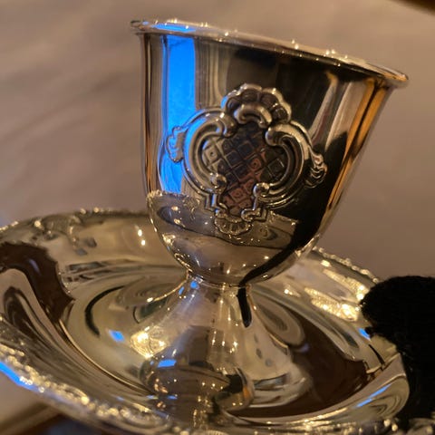 Eggeglass på stett med dekor av girlandere, stemplet 830S med ukjent stempel og gravert 18-4-09 og Rakel, knapt synlig. H:7,5 cm. Skje stemplet 830s med dato. L: 12 cm. Feilfri, i perfekt stand. Selges til høystbydende over 500kr. Budgivning avslutter 15/12 kl 21.30. Jeg har fått bud på 500. Hvem byr høyere?