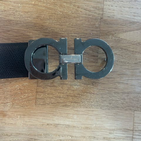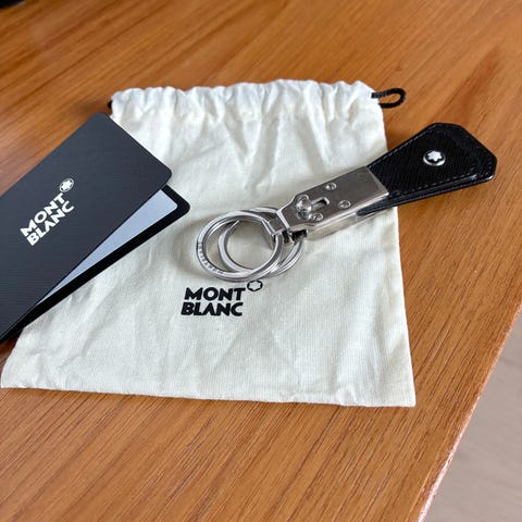 Montblanc herre belte laget av svart skinn. Belte har en metallspenne med Montblanc-logo.