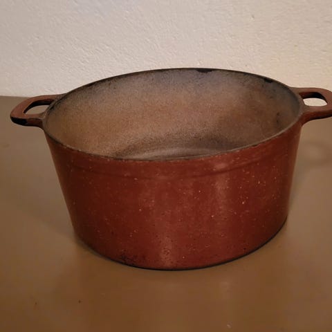 En Foss jernkjele med 2 håndtak, i god stand. Høyde 11 cm Diameter 24 cm bredde med håndtak 30 cm Vekt 2 kg.