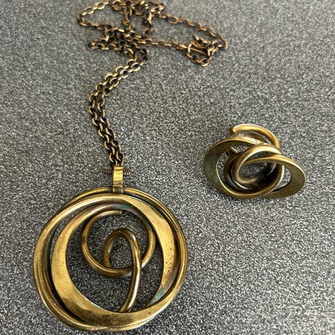 Selges vintage sølvsett halskjede med anheng, øredobber og ring.