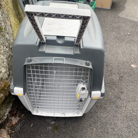 Transportbur for kjæledyr laget av blå plast med metallgrind og håndtak på toppen.