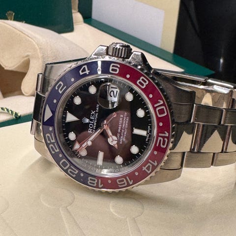 Referanse 116719BLRO er en meget spesiell versjon av GMT-Masteren og har en kasse og lenke utført i 18 karat hvitt gull. Materialet gir uret en tung og god tilstedeværelse på håndleddet, samtidig som det har et varmere gjenskinn enn stål. Bezelen i rødt og blått, en såkalt Pepsi-variant, går svært godt med den svarte skiven. Dette uret er kjøpt nytt i Norge i 2017 og er i god stand. Uret har i 2025 gjennomgått overhaling og har garanti fra Rolex.