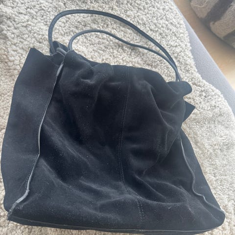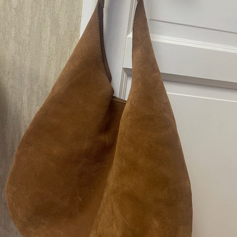 Flattered Alva shoulder bag i 100% kalveskinn, semsket, i fargen chocolate. Brukt et par mnd, ellers oppbevart i dustbag i skapet. Svært pent brukt. Et par veldig små flekker inni vesken. Se siste bilde for hvordan vesken er på skulderen (ikke riktig farge på dette bildet). Nypris var 4700,-.