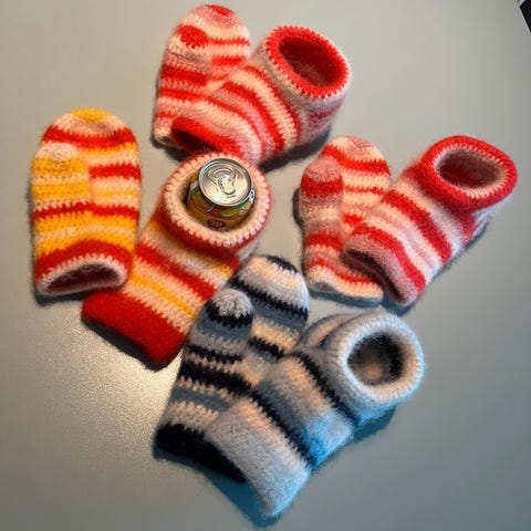 Sennepsgul og grønn er heklet i dobbelttråd superwash ullgarn. Disse er ekstra romslige, ekstra varme, ekstra stødige og ekstra holdbare. 400,-/stk (holder nå på med en i blå).