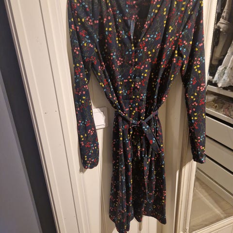 Lindex hverdagskjole i svart farge, størrelse S,. . Kjolen har fotsid, med volanger, lommer og knytebelte i livet.
