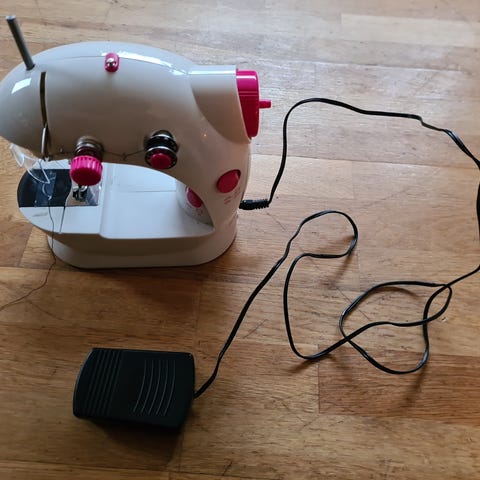 Kompakt og praktisk håndholdt symaskin – perfekt til raske reparasjoner, gardiner, klær og småprosjekter.