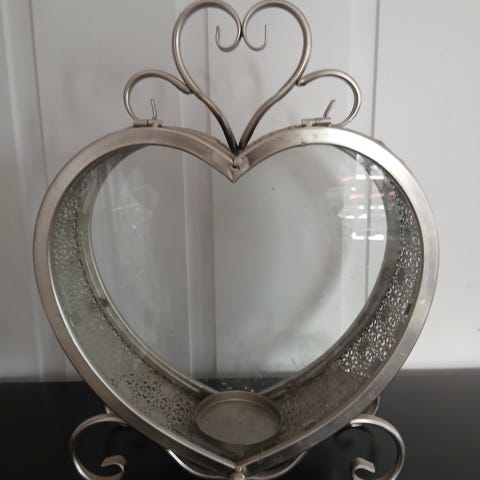 Metallhjerte med telysholder til å henge opp. Det var opprinnelig en speilplate i bakkant, men denne er knust. Ca. 40 cm. høyt og 27 cm. bredt.