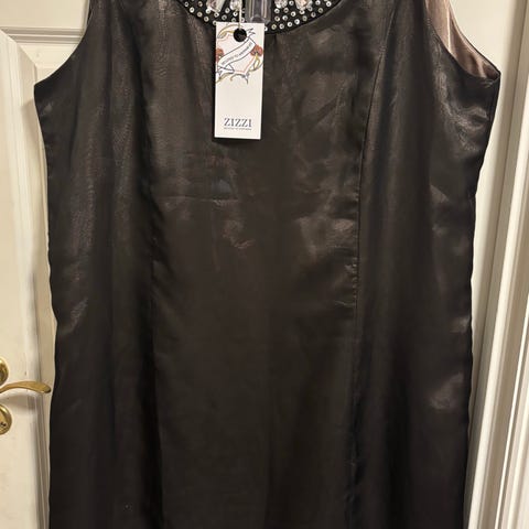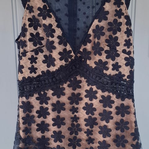 Zizzi festkjole i størrelse L, farge svart.. Kjolen har et mønster med blonder og inkluderer et belte i midjen.
