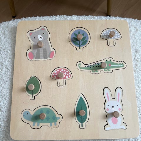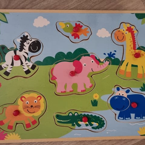 Barnespill puslespill med fargerike dyremotiver som løve, sjiraff, krokodille, elefant og andre dyr. Passer for barn og kan brukes til å lære om dyr og utvikle motoriske ferdigheter. Laget av treverk med brikker som passer godt sammen.