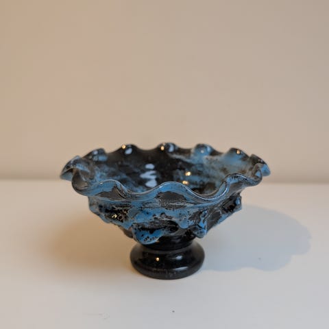 Vintage, håndlaget, rosa keramikkbolle med innrisset blad- og spiralmønster. Er signert med noe som ligner E og F Norge. Men aner ikke hvem som er kunstneren. Den er veldig fin og i god vintage stand. Ingen hakk eller skader.