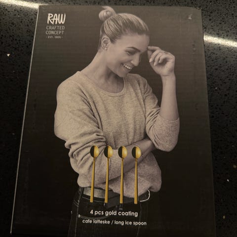 Selger et helt nytt sett med 4 lange latte-/iskjeer fra RAW Crafted Concept (Aida Copenhagen). Fortsatt i original eske og i plast - aldri brukt.