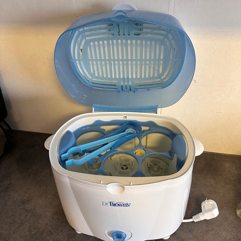 Dr. Browns elektriske sterilisator, flott for det første året for å sterilisere flasker, smokker osv. Den har to rom, ett for flasker nederst og ett øverst for silikon og mindre deler. Jeg kjøpte den brukt, og kjøleprosessen fungerer ikke, steriliseringen fungerer perfekt, så jeg pleide bare å vente til den ble avkjølt.