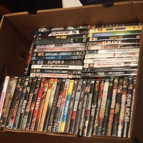 170-180 stk DVD'er i god stand. Flest innen sjangeren action og drama. Noe Eventyr, sci-fi og barnefilmer. Noen få musikkdvd'er.