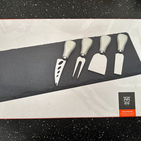 Brie ostesett fra den norske knivprodusenten Øyo. Består av en skiferplate og 4 ostekniver. Se bilde nr. 2 for nærmere beskrivelse. 2 stk. helt nye sett. (Kjøpt inn som gaver, men som ikke ble benyttet.) Kr. 250,- per sett.
