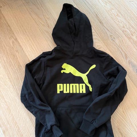 Puma genser for barn i størrelse 158. Genseren er svart med fargede detaljer på ermene, laget for unisex bruk.