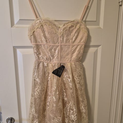 Nydelig rosa blondekjole. Blonder over det hele, underkjole under. Tynne stropper over skuldrene, glidelås bak.