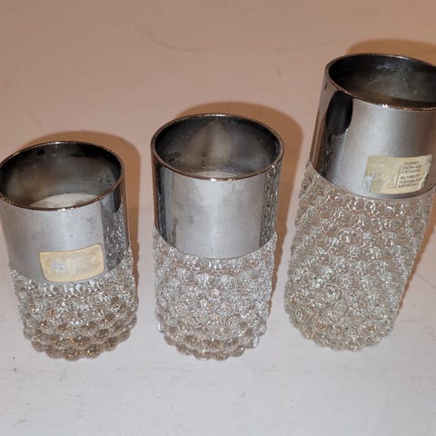 Meget pene. Stål og glass. Sjeldne. Diameter ca 4 cm. Høyde hhv. 7, 8 og 10 cm. Pris samlet.