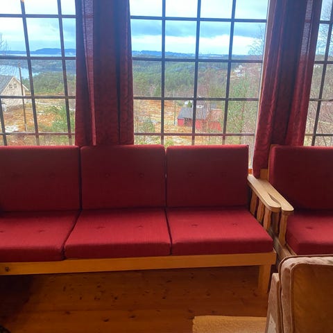 En godt brukt sofa som gis bort. Den er 290 cm i lengden og 160 cm i bredden.