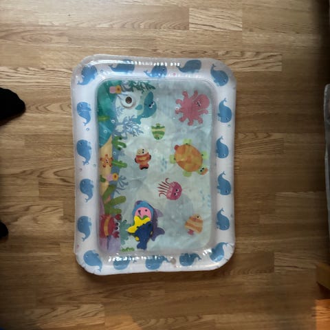 Godt brukt putteboks med sterke farger og ulike former. Lokket lager en pipelyd, men er bildet er lott slitt. Se bildet.