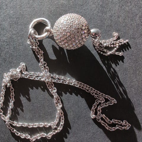 Flott, rundt anheng i sølv, med en stor fasettslipst klar krystall i midten omkranset av små zirkoner.