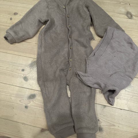 Dress i ullfleece med tilhørende balaklavalue i 100% ull fra Wheat. Pent brukt av 1 barn. Vasket på ullprogram med mill, 30 grader