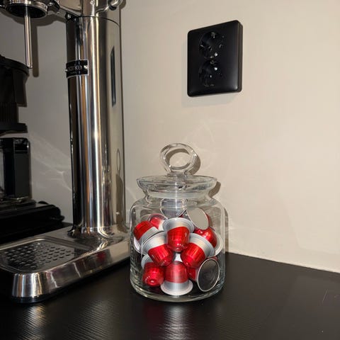 Rosendahl kjøkkentilbehør bestående av en glassbeholder med svart lokk og tilhørende børste. Beholderen har en gjennomsiktig glasskropp, og lokket samt børsten er i svart materiale. Produktet er egnet for marinade, olje, smør etc