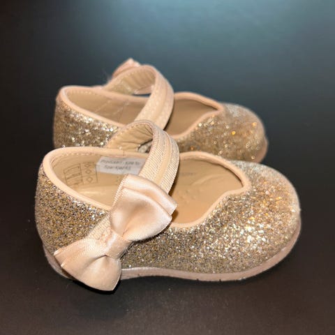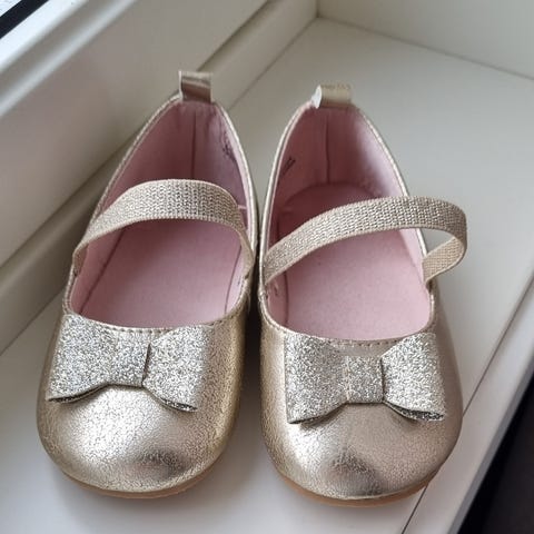 Søte ballerinasko i gull med bånd over vrista og sløyfe. Mye og behagelig for en liten babyfot.