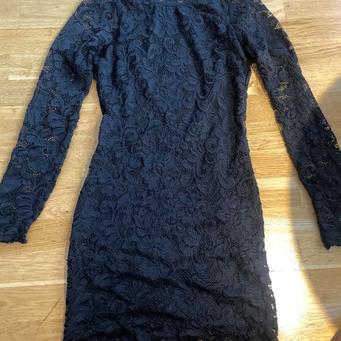 Svart kjole til spesiell anledning i størrelse M. Kjolen har lange ermer og er laget av blonder.