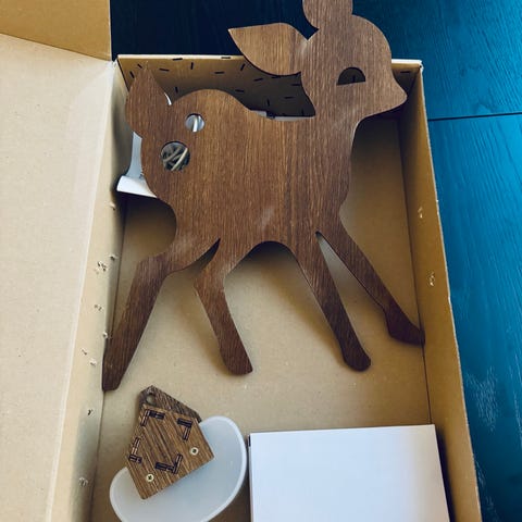 Vegglampe Bambi i tre fra ferm living, designet for barnerom. Lampen har form som en bambi og gir et mykt lys, egnet for å skape en koselig atmosfære. Kampen må hentes på Setskog, evt. Bjørkelangen