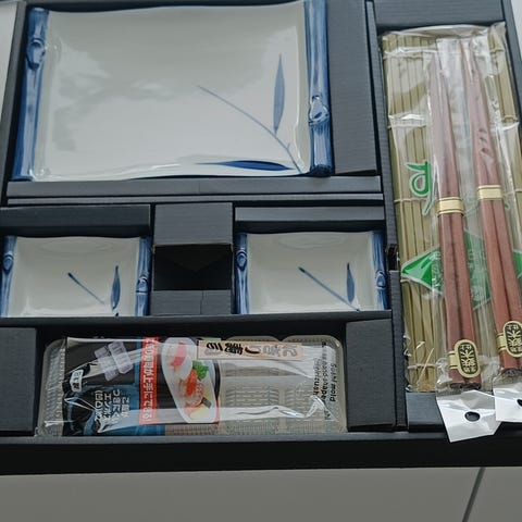 Fire rektangulære fat, har blitt brukt til å spise sushi fra, men er allsidige.