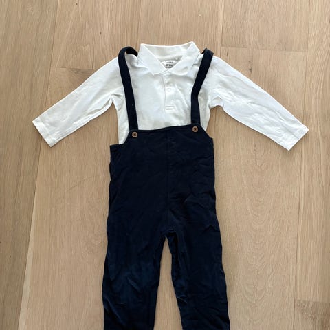 MarMar Copenhagen barneklær, penklær i størrelse 86 for gutt. Selebukse i brun med svakt nålesting mønster. Body i crem hvit, med bestefars knapper øverst og ribbet ellers. Svak gjennomblødning av navnestempel på bakside.